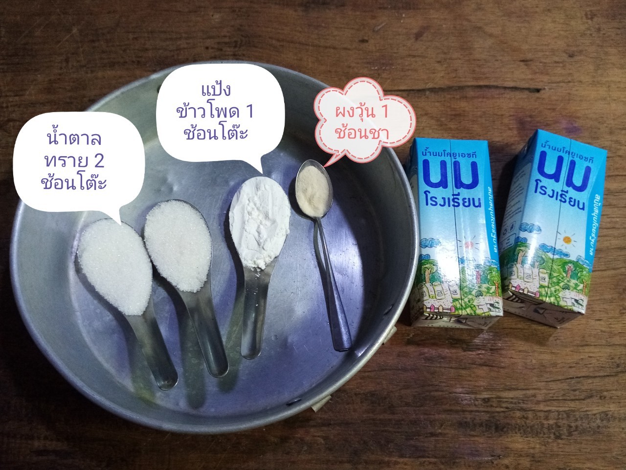1. เทนมโรงเรียน 2 กล่องลงในหม้อผสม