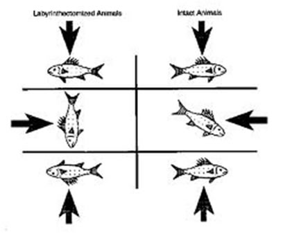 จากภาพตำแหน่งการว่ายน้ำของปลา ไม่ว่าจะเคลื่อนตัวไปในทิศทางใด จะรักษาตำแหน่งให้ร่างกาย ที่ตั้งฉากกับดวงอาทิตย์เสมอ (Dorsal light reaction )ซึ่งพฤติกรรมเช่นนี้ทำให้ศัตรูมองไม่เห็นตัวปลา เป็นการหลบหลีกศัตรูได้อีกวิธีหนึ่ง |