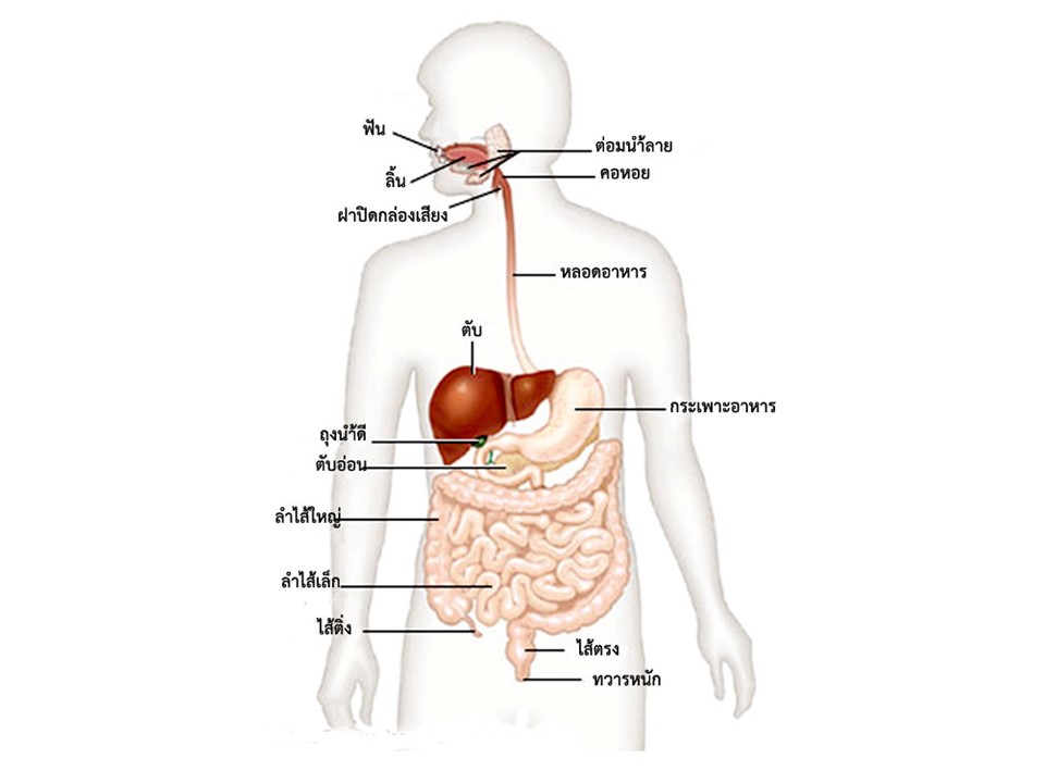 อวัยวะที่เกี่ยวข้องกับการย่อยอาหารของมนุษย์ แบ่งได้เป็น อวัยวะที่เป็นทางเดินอาหาร และอวัยวะที่ไม่อยู่ในทางเดินอาหาร      ๐ อวัยวะที่เป็นทางเดินอาหาร ได้แก่ ปาก (Mouth)  คอหอย (Pharynx) หลอดอาหาร (Esophagus)  กระเพาะอาหาร (Stomach) ลำไส้เล็ก (small  Intestine) ลำไส้ใหญ่ (large Intestine) ทวารหนัก  (Anus)