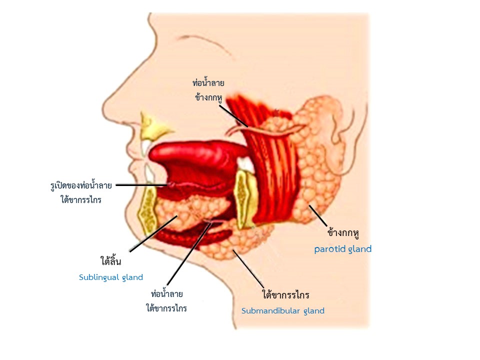 เมื่อรับประทานอาหาร ส่วนแรกของทางเดินอาหาร คือ ปาก ภายในช่องปาก มีฟันทำหน้าที่บดเคี้ยว อาหารให้มีขนาดเล็กลง ลิ้นจะช่วยคลุกเคล้าอาหารกับน้ำลาย อาหารที่ผ่านการคลุกเคล้ากับน้ำลายแล้ว ทำให้สะดวกต่อการกลืน ในน้ำลายมีเอนไซม์อะไมเลส ที่ช่วยย่อยอาหารพวกคาร์โบไฮเดรต       น้ำลายผลิตจาก ต่อมน้ำลาย (Salivary gland) ประกอบด้วยน้ำ 99.5 เปอร์เซ็นต์ pH อยู่ระหว่าง 6.2-7.4 มีส่วนประกอบที่เป็นเมือก       ช่วยให้อาหารอ่อน และลื่นทำให้กลืนง่าย ทำให้ในปากเปียกชุ่มชื้นไม่แห้ง สะดวกต่อการพูด ช่วยให้ปาก และฟันสะอาดช่วยลดการเจริญเติบโตของแบคทีเรียได้บ้าง เป็นตัวแปรสำคัญในเรื่องสมดุลน้ำในร่างกาย เพราะถ้าร่างกายขาดน้ำ น้ำลายจะข้น และทำให้กระหายน้ำ นอกจากนี้ในน้ำลายมีเอนไซม์อะไมเลส (amylase ) ช่วยย่อยอาหารประเภทคาร์โบไฮเดรต เช่น แป้ง และไกลโคเจน ได้                 ๐ ที่กกหู  1  คู่ เรียก parotid gland