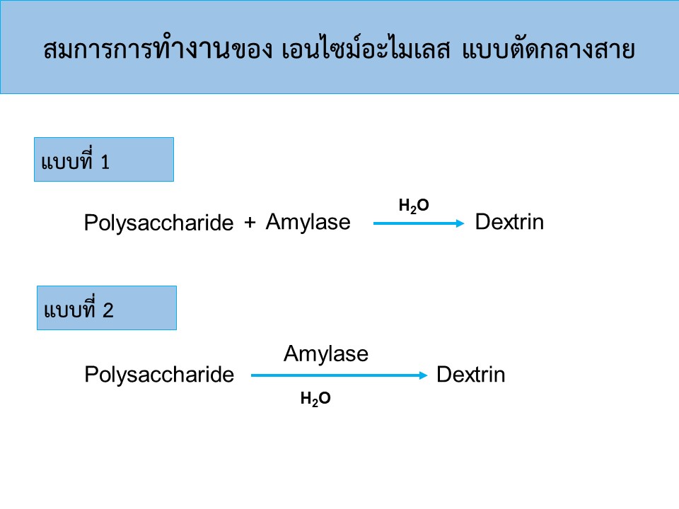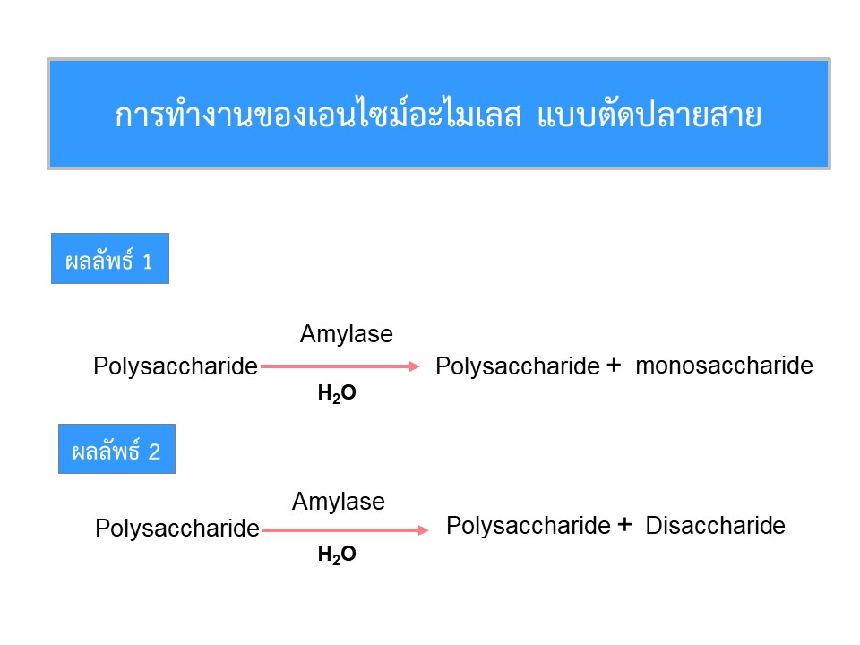 จากแผนภาพผลของการทำงานของเอนไซม์ อะไมเลสแบบตัดกลางสายจะได้ผลผลิต คือ เด็กซ์ทริน(Dextrin) การทำงานของเอนไซม์เป็นในลักษณะของปฏิกิริยาเคมี สามารถเขียนแสดงเป็นสมการทางเคมีได้