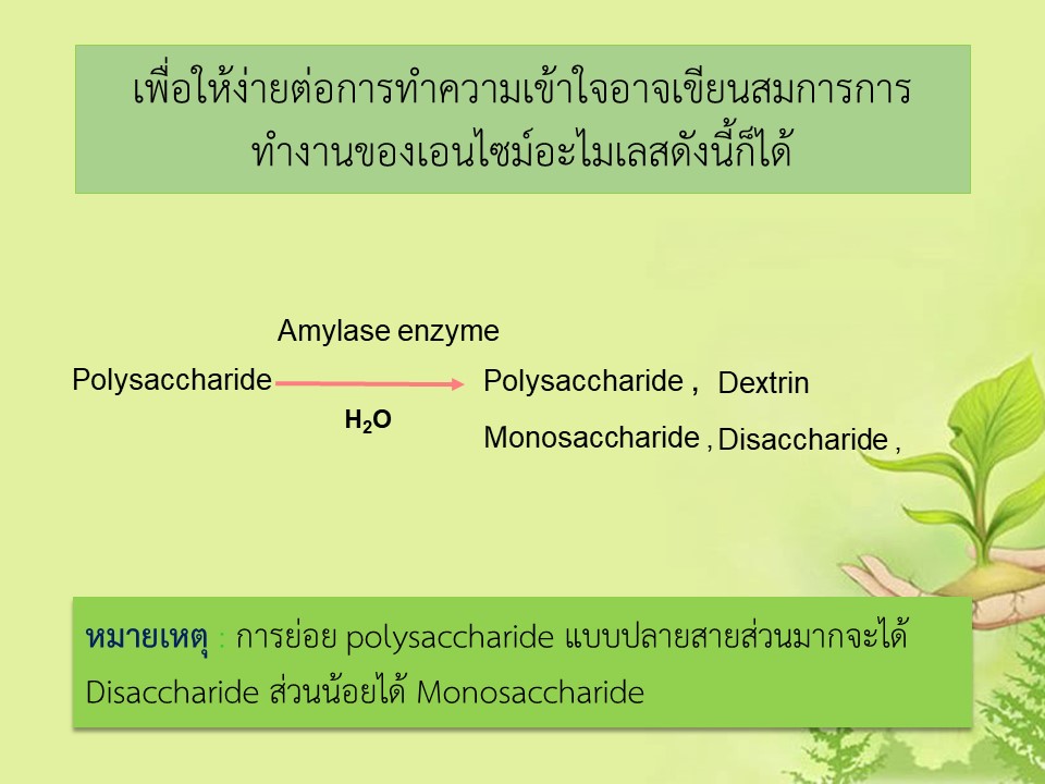 ในปากมีเอนไซม์ที่ใช้ในการย่อยอาหาร คือ  เอนไซม์อะไมเลส (Amylase ) ทำหน้าที่ย่อยอาหารพวกคาร์โบไฮเดรต  พวกแป้ง ไกลโคเจน ซึ่งเป็นคาร์โบไฮเดรตโมเลกุลใหญ่ (Polysaccaride) การทำงานของ         ๐ การตัดกลางสาย
